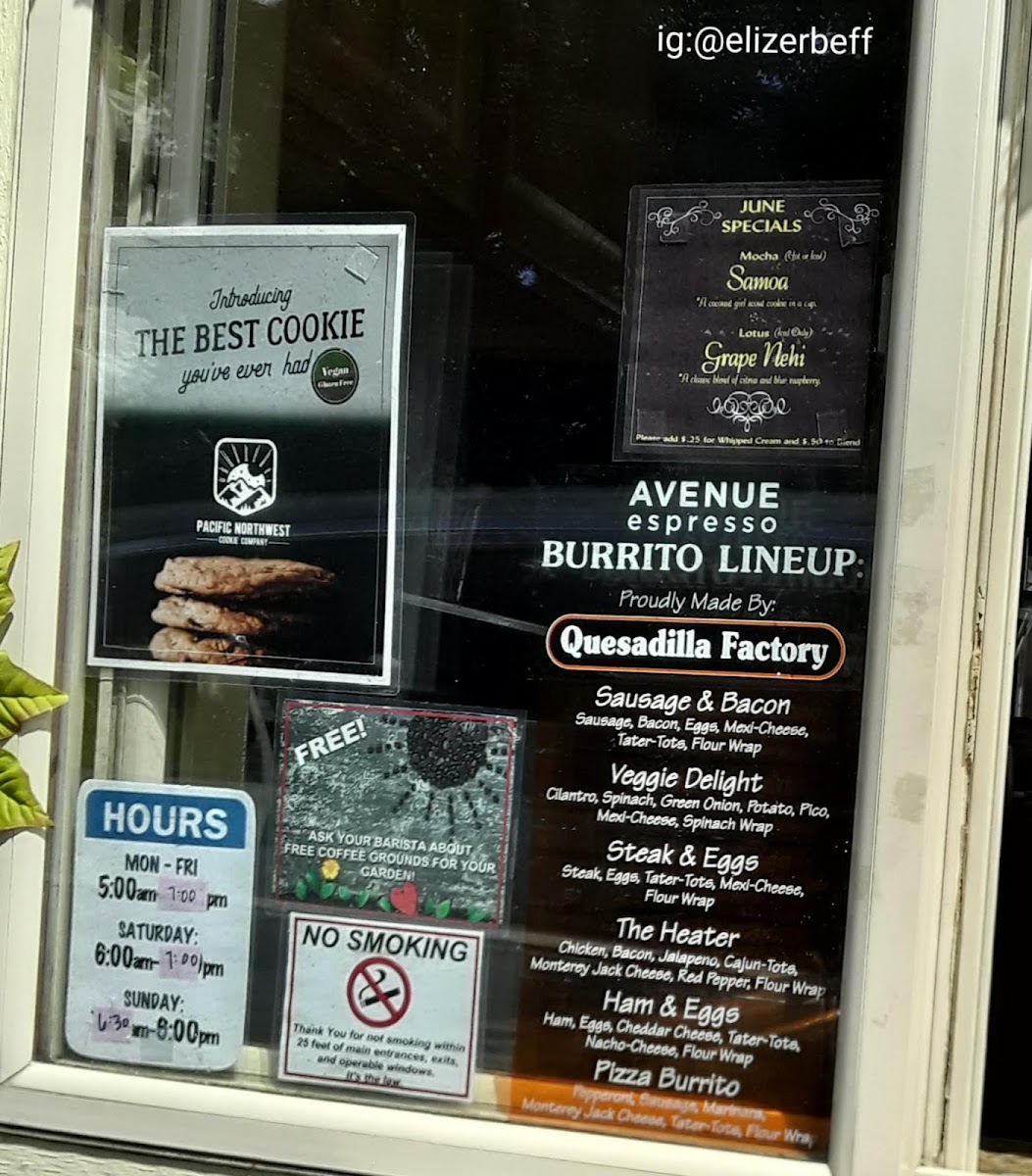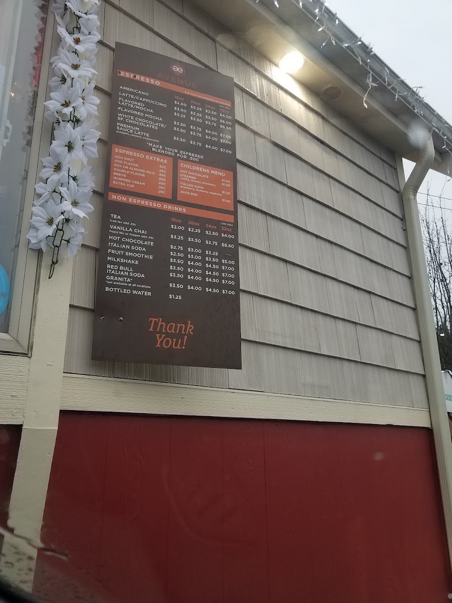 From a reviewer’s perspective, the menu at Avenue Espresso - Trosper Rd, located at 690 Trosper Rd SW, Tumwater, feels thoughtfully simple and well-suited for both quick stops and everyday comfort. The espresso selection highlights classics like Americano and Latte, delivering exactly what coffee lovers expect-clean, familiar flavors done right. Customization is easy thanks to espresso add-ons such as Soy Milk and Almond Milk, which cater well to different dietary preferences. For younger guests, the Children’s Menu keeps things approachable with Hot Chocolate and Juice Box, making the spot family-friendly. The Non-Espresso Drinks section rounds out the menu nicely, offering comforting and refreshing choices like Vanilla Chai, Hot Chocolate, Italian Soda, and Bottled Water, ensuring there’s something for everyone, even non-coffee drinkers. Overall, the menu may be concise, but it’s well-balanced, practical, and reflective of a neighborhood coffee shop that understands its customers’ everyday needs.
